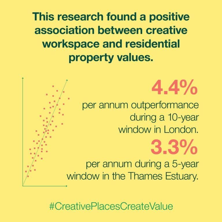 The research uses house price data in various locations recognised as clusters of creative workspaces, analysed over various time frames, in order to identify the level of outperformance in house price data relative to the wider market. It focusses on case studies of creative clusters in London (Hackney Wick, Woolwich Dockyard & Tottenham) and the Thames Estuary (Margate, Southend, Basildon, Thurrock & Medway), and standalone schemes where creative workspace had been included in a residential scheme in London (Galleria in Peckham, Bow Arts in Royal Albert Docks, ASC Arthouse in Croydon & Second Floor Studios in Wembley).